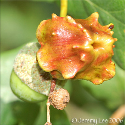 ![]() Gall causer: Andricus quercuscalicis Common Name: Oak Knopper Gall Knopper galls on our traditional English oak, Quercus robur, are caused by a minute gall wasp, Andricus quercuscalicis. The insect is a relative newcomer to Britain, the first recorded sighting being in 1962. It appears to have arrived naturally from the continent and rapidly spread across England and Wales. In 1979 it underwent a population explosion and for a time there was real concern that it would seriously affect the acorn fertility and thus the future of our most iconic tree. Like most gall wasps, the life cycle is complicated, with an alternation of a sexual and asexual generation each year. Only females emerge from the knopper galls and these lay their eggs in the buds of the Turkey Oak, Quercus cerris. In the spring this sexual generation causes minute galls in the male catkins. And why "knopper" gall? The Oxford English Dictionary defines a 'knop' as "a small rounded protuberance, boss, stud, button, tassel or the like". |