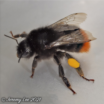 Scientific Name: Bombus lapidarius Common Name: Red-tailed Bumble Bee Bombus lapidarius, more commonly known as the Red-tailed Bumble Bee, is a very distinctive bumble bee. The queens of this common and widespread species are large and mainly black with a rusty red tail. Queens often emerge from hibernation 3 to 4 weeks later than those of the white-tailed bumble bee (Bombus lucorum) and buff-tailed bumble bee (Bombus terrestris). Workers have a similar colour pattern to queens and appear from mid to late May. Males of this species are distinguished from queens and workers by the presence of a tuft of yellow hair on their face and a yellow band around the top of the thorax. Commonly seen in gardens and hedgerows, the red-tailed bumble bee often nests under stones or slabs. This species is unlikely to sting unless its nest is endangered. However, red-tailed bumble bees will often fly menacingly around the heads of intruders, in an attempt to prevent damage to their nests. Confusion with the much rarer Bombus ruderarius is possible as the basic colour pattern is similar. |