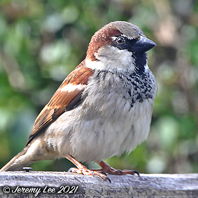 Scientific Name: Passer domesticus Common Name: House Sparrow Passer domesticus, more commonly known as the House Sparrow, is approximately 15cm in length with streaked brown back and wings and a stout bill in both sexes. The male is discernable by his grey crown and black eyes and bib. The female has a brown crown, no bib, but has a lighter coloured head stripe running from front to back across the eyes. Eats mainly seeds, insects and spiders, but will eat almost anything on the bird table in winter. Gregarious at all times. Their nest, usually wedged into a hole or on a building ledge, often amongst ivy and other creepers, is an untidy mass of grass and straw, often with paper and string, and lined with hair and feathers. Sometimes they are built in a hedge, and these are usually a neater, domed structure. Found in parks, gardens and neighbouring fields and hedgerows; rarely far from human habitation. Present throughout the UK but suffered a decline through the 1990's, although seems to be making a strong recovery. |