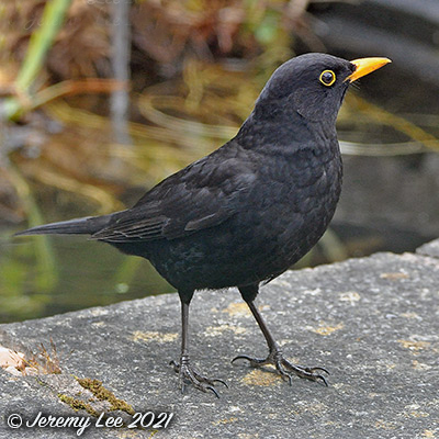 Scientific Name: Turdus merula Common Name: Blackbird Turdus merula, more commonly known as the blackbird, is approximately 25cm in length. The male is jet black with a bright orange-yellow bill and eye ring; the female is a medium brown colour with some spotting on the breast; she also has a more subdued yellow eye ring and bill when compared to the adult male. Juveniles look more like adult females but with a brown bill and eye ring. Their song is rich and melodious, almost flute-like, with a variety of phrases, and the commonest call heard is a loud "pink-pink-pink", uttered when the bird is alarmed for some reason. Blackbirds are omnivorous, taking worms, insects and other invertebrates as a matter of course, but they love fruit and will often visit bird tables for kitchen scraps. Their nest is a cup made with grass and other plant material, lined with mud and then with fine grass and other soft materials; usually built by the female in dense vegetation, often in honeysuckle or ivy. Can be found almost anywhere in the UK with trees and bushes; one of our commonest and most visible birds and present in almost every garden in every town. |