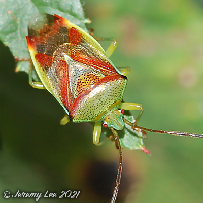 Scientific Name: Elasmostethus interstinctus Common Name: Birch Shield Bug Elasmostethus interstinctus, more commonly known as the Birch Shield Bug, has a length of 8-11mm, and is a distinctive species, although confusion with the larger and more elongate Hawthorn Shield Bug A. haemorrhoidale is possible. The lateral extensions of the pronotum are smaller in E. intersinctus, and are not marked with red, while the scutellum of A. haemorrhoidale is green, and the abdomen frequently red-tipped. This species overwinters as an adult, emerging and mating in the spring. The larvae feed principally on birch, but may also be found on hazel and aspen; the new generation is complete by August. Common and widespread in mixed birch woodlands across Britain and Ireland. |