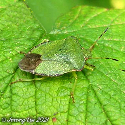 Scientific Name: Palomena prasina Common Name: Common Green Shield Bug Palomena prasina is a large shield bug (length 12-13.5 mm) with a dark wing membrane and reddish antennae (4th and 5th segments). Adults are bright green in the spring and summer, but finely punctured with dark marks. They become a darker bronze-brown prior to winter hibernation. There is one generation per year; the nymphs feed on many deciduous trees and shrubs, particularly hazel, and can be found from June to October. Later nymphs are often darker than those found earlier in the season. Usually the imago stage is reached in September, with hibernation occurring in November. Newly-emerged adults may show a pale wing membrane, leading to possible confusion with Nezara viridula, a recent arrival in southern England. Common and widespread throughout Britain and Ireland, becoming scarcer further north. May be found in many habitats, including parks and gardens. |