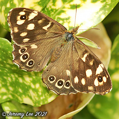 Scientific Name: Pararge aegeria Common Name: Speckled Wood Pararge aegeria, more commonly known as the Speckled Wood, is a common butterfly and familiar to many observers, especially in woodland where, as its name suggests, it is most often found. With a wingspan of 4 - 4.5cm, it has brown wings with pale yellow spots, especially on forewings; forewing with one eye-spot, hindwing with three. In the female (pictured) the pattern of yellowish spots is more extensive than in the male and the underside of the hind wing marbled brown yellow. Distributed throughout the UK, but decreasing in numbers the farther north you travel. Found in open deciduous woods, on the edges of woods, in clearings, and along forest rides. Prefers to remain in shade and half-shade and readily rests on the leaves of shrubs and herbaceous plants. They feed on nectar and the juices of overripe berries; also on excrement and flowing tree sap. The male will vigorously defend his territory against intruders. |