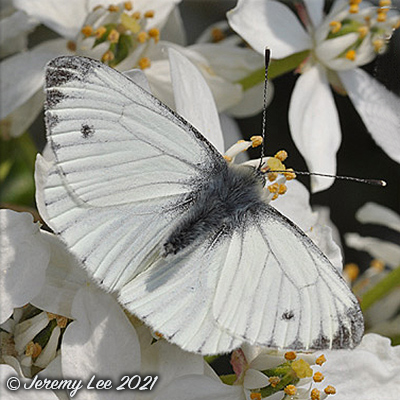 Scientific Name: Pieris napi Common Name: Green-veined White Pieris napi, more commonly known as the Green-veined White, is a common butterfly of damp grassland and woodland rides and is often mistaken for its cousin, the Small White. It can be found from spring through to autumn in parks and gardens, as well as less-urban areas such as meadows and woodland rides. The so-called green veins on the underside of the adults are, in fact, an illusion created by a subtle combination of yellow and black scales. This is one of the most widespread species found in the British Isles and can be found almost everywhere although it is absent from the Shetlands and areas of the Scottish Highlands. First-brood adults typically emerge in late April, peaking around the middle of May and gradually tailing off through June. The second brood, which is always stronger than the first brood, starts to emerge in early July. However, in good years, the second brood may emerge in late June and give rise to a third brood. |