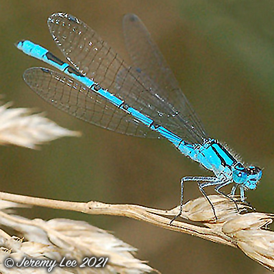 Scientific Name: Enallagma cyathigerum Common Name: Common Blue Damselfly Enallagma cyathigerum, more commonly known as the Common Blue Damselfly, can be easily mistaken for the Azure Damselfly (Coenagrion puella), but on the back and the thorax, the Common Blue Damselfly has more blue than black; for the Azure Damselfly it is the other way around. The second segment of the thorax has a distinctive spot with a line below connecting to the third segment. Another difference can be observed when inspecting the side of the thorax. The Common Blue Damselfly has only one small black stripe there, while all other blue damselflies have two. This small, brightly coloured damselfly is probably the most common of dragonflies and damselflies throughout much of Britain. It inhabits a wide range of habitats, from small ponds to rivers. They are especially common at lakes and reservoirs. |