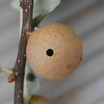 Gall causer: Andricus kollari Common Name: Oak Marble Gall These galls, on our traditional English oak, Quercus robur, are caused by a minute gall wasp, Andricus kollari. Formed in buds, they can grow up to about 25mm in diameter. The gall starts life green in colour, but changes to brown by the autumn, when the adult wasps emerge. With a length of 1.5 to 2mm, the male wasp is very dark brown to black on the head, has a hunched thorax and a black abdomen. The legs are yellowy brown and the antennae are a translucent yellow/brown colour. The female has a dark brown appearance overall. The gall is seen more often than the adult wasp. The empty gall, now showing a neat little hole in the side where the wasp emerged, remains on the twig. Like most gall wasps, the life cycle is complicated, with an alternation of a sexual and asexual generation each year. |