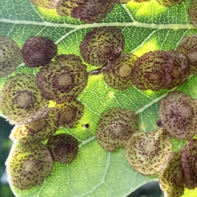 Gall causer: Neuroterus quercusbaccarum Common Name: Oak Spangle Gall The Oak Spangle Gall is caused by the cynipid wasp Neuroterus quercusbaccarum, which has both agamic and bisexual generations, causing different galls to occur on Oak. The gall is more likely to be seen than the adult wasp. The male and female of the bisexual generation emerge in June from Currant Galls which are spherical, smooth, succulent, berry-like galls up to 7 mm in diameter which vary in colour from pale yellow through green to red or purple.These galls may occur on Oak leaves or catkins. After mating the fertilised eggs are laid by the sexual generation in the lower epidermis of the Oak leaves. The Spangle Galls develop over the winter and the insects emerge in April, laying their eggs in the catkins or lower epidermis of leaves. The cycle, an alternation of generation, then begins again. Common and widespread throughout the UK. |