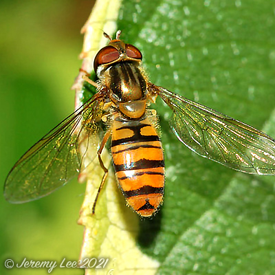 Scientific Name: Episyrphus balteatus Common Name: Marmalade Hoverfly Episyrphus balteatus, sometimes called the marmalade hoverfly, is a relatively small hoverfly (9–12 mm) of the Syrphidae family, widespread throughout the UK. Like most other hoverflies, it mimics a much more dangerous insect, the solitary wasp, though it is a quite harmless species. The upper side of the abdomen is patterned with orange and black bands. Two further identification characters are the presence of secondary black bands on the third and fourth tergites and faint greyish longitudinal stripes on the thorax. They can be found throughout the year in various habitats, including urban gardens, visiting flowers for pollen and nectar. They often form dense migratory swarms, which may cause panic among people for their resemblance to wasps. It is among the very few species of flies capable of crushing pollen grains and feeding on them. The larva is terrestrial and feeds on aphids. |