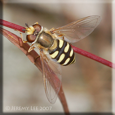 Scientific Name: Eupeodes corollae Common Name: N/A Eupeodes corollae is a very common European species of hoverfly. Adults are 6–11 millimetres in body length. Males and females have different marking on the abdomen; males have square commas on tergites 3 and 4, whereas females have narrow commas. Larvae feed on aphids. This species has been used experimentally in glasshouses as a method of aphid control, and to control scale insects and aphids in fruit plantations. They were found to be partial to the fruit, eating more fruit than aphids. Adults are often migratory. |