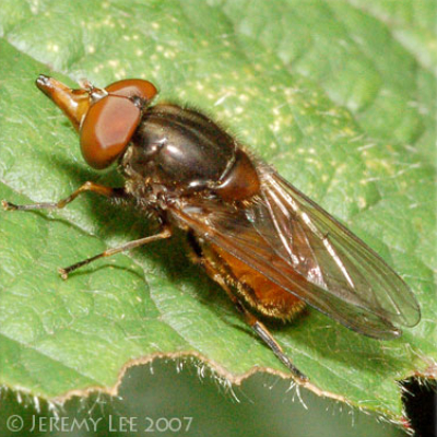 Scientific Name: Rhingia campestris Common Name: N/A Rhingia campestris is a common hoverfly; adults feed on the nectar of flowers like White Dead-nettle and Red Dead-nettle, and the larvae live and feed in animal dung. It has a long snout that enables it to reach the nectar in tubular flowers, such as the Bluebell (Hyacinthoides non-scripta), which other flies cannot reach. It has a rounded, dark orange body, dark brown thorax, and distinctive, long, orangey-brown snout. Widespread throughout the UK on grassland, woodland, wetlands and towns and gardens. On the wing March to November. |