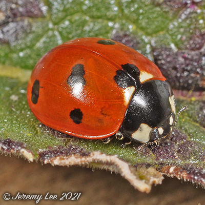 Scientific Name: Coccinella septempunctata Common Name: 7-Spot Ladybird Coccinella septempunctata, more commonly known as the 7-spot ladybird, is approximately 5-8mm in length. They have three and a half spots on each of their two wing cases. The thorax is black with two white marks at the side, and the head is small and black. Larvae have lumpy grey-blue skin with yellow spots at the sides of their abdomens. They inhabit gardens, woodland, hedgerows and meadows and have a varied diet of small insects but favour plant-lice and aphids. The 7-Spot, as with other ladybirds often hibernate in large groups in sites which are used year after year. Ladybirds can be seen piled on top of one another while hibernating, the advantage of this is perhaps that less heat is lost, increasing their chances of surviving the cold of winter. In the main breeding season, May and June, mating seven-spots are a common sight in our hedgerows and gardens. |