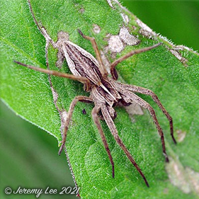 Scientific Name: Pisaura mirabilis Common Name: Nursery Web Spider Pisaura mirabilis, or the Nursery Web Spider, is a member of the family Pisauridae. They resemble wolf spiders (family Lycosidae), but they carry their egg sacs by means of their jaws and pedipalps (instead of attaching them to their spinnerets). When the eggs are about to hatch, a mother spider will build a nursery "tent," put her egg sac inside, and mount guard outside. Unlike the wolf spiders, which have two very prominent eyes in addition to the other six, the eyes of the nursery web spiders are more or less the same size. Many species are able to walk on the surface of still bodies of water, and may even dive beneath the surface for a time to escape enemies. In escaping predators, they may very well jump a distance of five or six inches. The female spider will sometimes attempt to eat the male after mating; the male, to reduce the risk, will often present her with a gift such as a fly when approaching in the hope that this will satisfy her hunger and protect him from harm. |