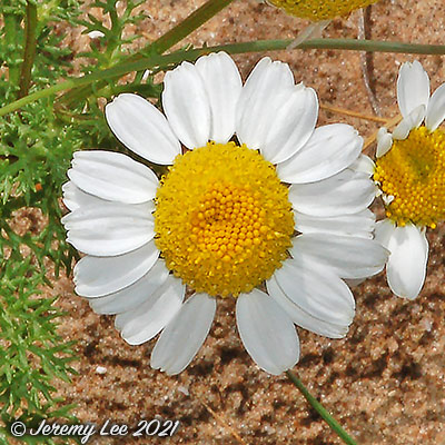 Scientific Name: Matricaria recutita Common Name: Scented Mayweed Matricaria recutita, commonly known as Scented Mayweed, is a daisy-like annual with finely divided leaves and an aromatic smell when crushed. It is superficially like Corn Chamomile but is hairless with more finely divided leaves. Note that until recently this species was known by the old botanical name of Matricaria chamomilla. It has a branched, erect and smooth stem, which grows to a height of 15–60cm. The long and narrow leaves are bipinnate or tripinnate. It is a native of southern Europe, introduced to these islands with the spread of agriculture. It is now a common annual of arable land (particularly cereal crops) and all types of waste lands. It thrives best on lighter soils but can grow on loams and heavy clays. Flowers June to October. |